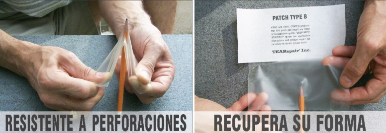 Cada parche de reparación TEAR-AID ® se hace excepcionalmente resistente con acabado en mate, resistente a la abrasión, elastómero que resiste la perforación y el desgarro. Se combina con un adhesivo agresivo formulado para una alta fuerza de adherencia, a una variedad de superficies tales como tela, cuero no graso, caucho, nylon, la mayoría de los plásticos, pinturas, aluminio, acero inoxidable, fibra de vidrio, poliuretano, polietileno, polipropileno, vinilo y revestimiento de vinilo. TEAR-AID ® Tipo A y TEAR-AID ® Tipo B proporciona un método simple y efectivo de reparar agujeros y desgarros, dejando una película protectora como excelente solución.